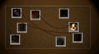 Explore the cabin by pointing and clicking at walls and doors. Interact with NPCs by clicking on them, and click on interesting objects to take photos of them. Press TAB at any point to access your evidence, and connect relevant pieces of evidence on the board by selecting a word from their descriptions and dragging between their pins.